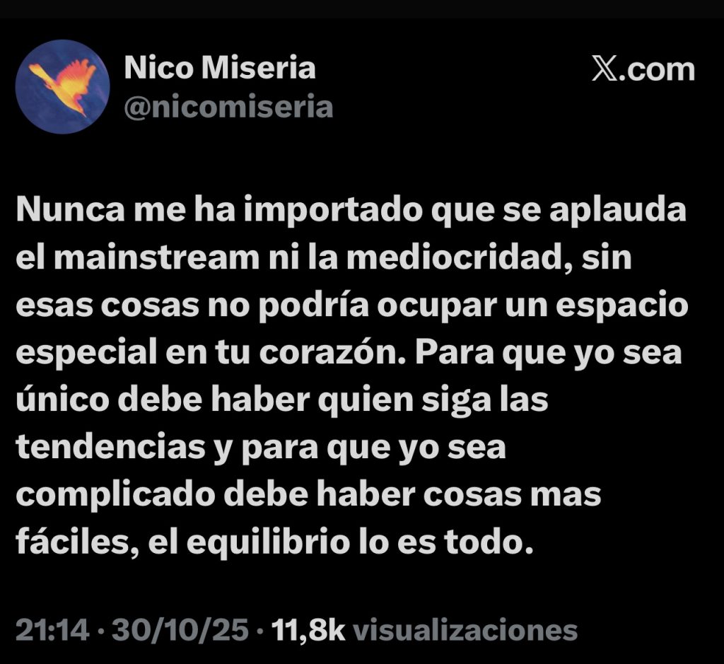 Se van subiendo al tren nuevos oyentes, y desconozco como fue para el resto de sus fanáticos, pero en mi caso me subí en base a una recomendación, imagino que no fui la única. Este es el marketing más caro que hay porque el precio es mantenerte en tus principios y ser auténtico. Solo en ese caso te conviertes en trascendental y te compran sin venderte. En la línea de la autenticidad abrimos el melón de castigar al mainstream, a Aitana y a Quevedo por su falta de la misma… De nuevo en defensa de esto, en el X (Twitter) de Nico encuentro un punto de vista muy interesante:
