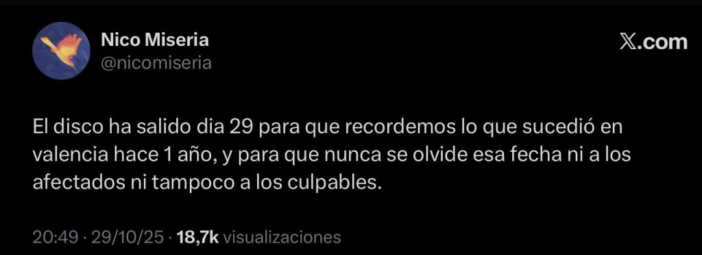 No es azar que el lanzamiento coincida con el aniversario de la dana que azotó sin piedad el territorio valenciano un año atrás. No encaja el discurso de Nico sin este tipo de gestos. Pasamos por alto a menudo la responsabilidad con las masas de los que portan un altavoz, y aunque debiera verse con normalidad que el foco se use en pro del pueblo, no es así.