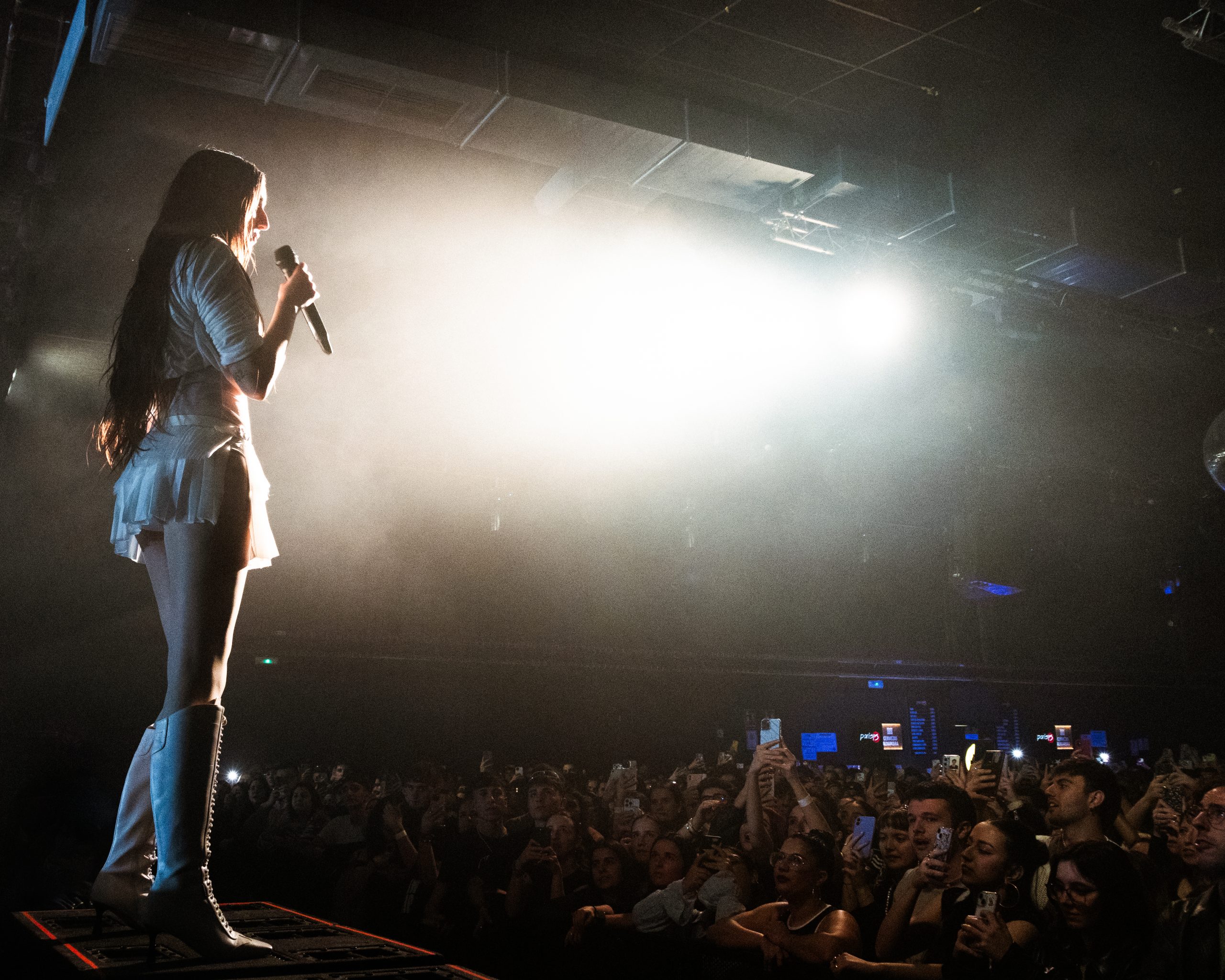 Todo esto decaería con lo siguiente, pues uno de los momentos más emotivos del concierto llegaría al recordar que «en Andalucía no se dice pendientes». Con «zarcillos de plata», un mar de flashes iluminaba la París 15 como si fuese una ciudad vista desde arriba; luces que se movían como palmeras atacadas por el viento, de un lado al otro y al ritmo de la canción.