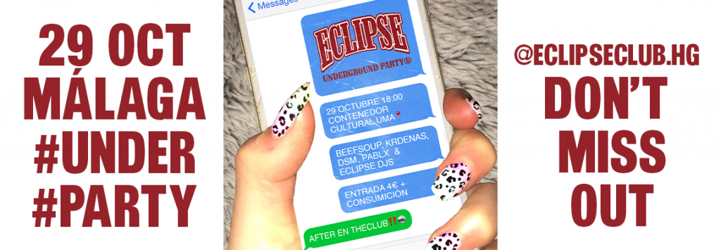 Málaga acoge la tercera edición de ECLIPSE, el evento que reúne a los más fans de la escena urbana underground. ECLIPSE no es solo una fiesta, sino también es una plataforma para catapultar jóvenes talentos, en esta edición dsm, Pablx y Beefsoup tendrán su oportunidad. Con otras dos ediciones a sus espaldas ECLIPSE viene a consolidarse. Si en la más reciente ya consiguió colgar el cartel de sold out, ¿quién sabe qué pasará esta vez?