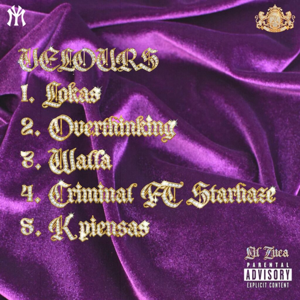 VELOURS llama la atención desde su ostentosa portada: un llamativo tejido morado de terciopelo coronado con un broche dorado y de diamantes al más puro estilo del reggaeton clásico que representa la sensualidad de las canciones que podemos escuchar dentro. Un conjunto de 5 temas con bases suaves, tal y como reza su título, mezcladas con letras románticas y atrevidas, producidas por Spilkkk y nicolK.