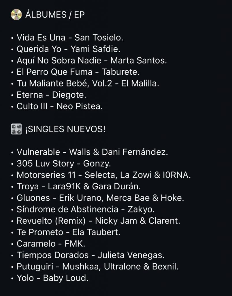 Supongo que al final es bueno que haya tantos lanzamientos que se adapten a los gustos musicales de la gente, pero personalmente necesito más de una semana para escuchar un disco y saber si me gusta. Lo importante es que esto da libertad creativa a los artistas, quienes pueden hacer y hacer música hasta llegar a su sonido. Pero bueno, que tu amigo no se escandalice si no has escuchado Lux o el ultimo disco de su cantante favorito que no llega a los 50 mil oyentes mensuales y que ya tiene algún comentario diciendo que suena parecido a x artista. O acaso ¿tu no te cansas de que tu playlist sea todo el rato música nueva? ¿o por otro lado llevas escuchando lo mismo desde mayo?