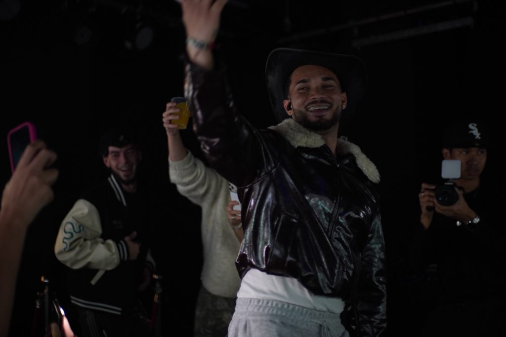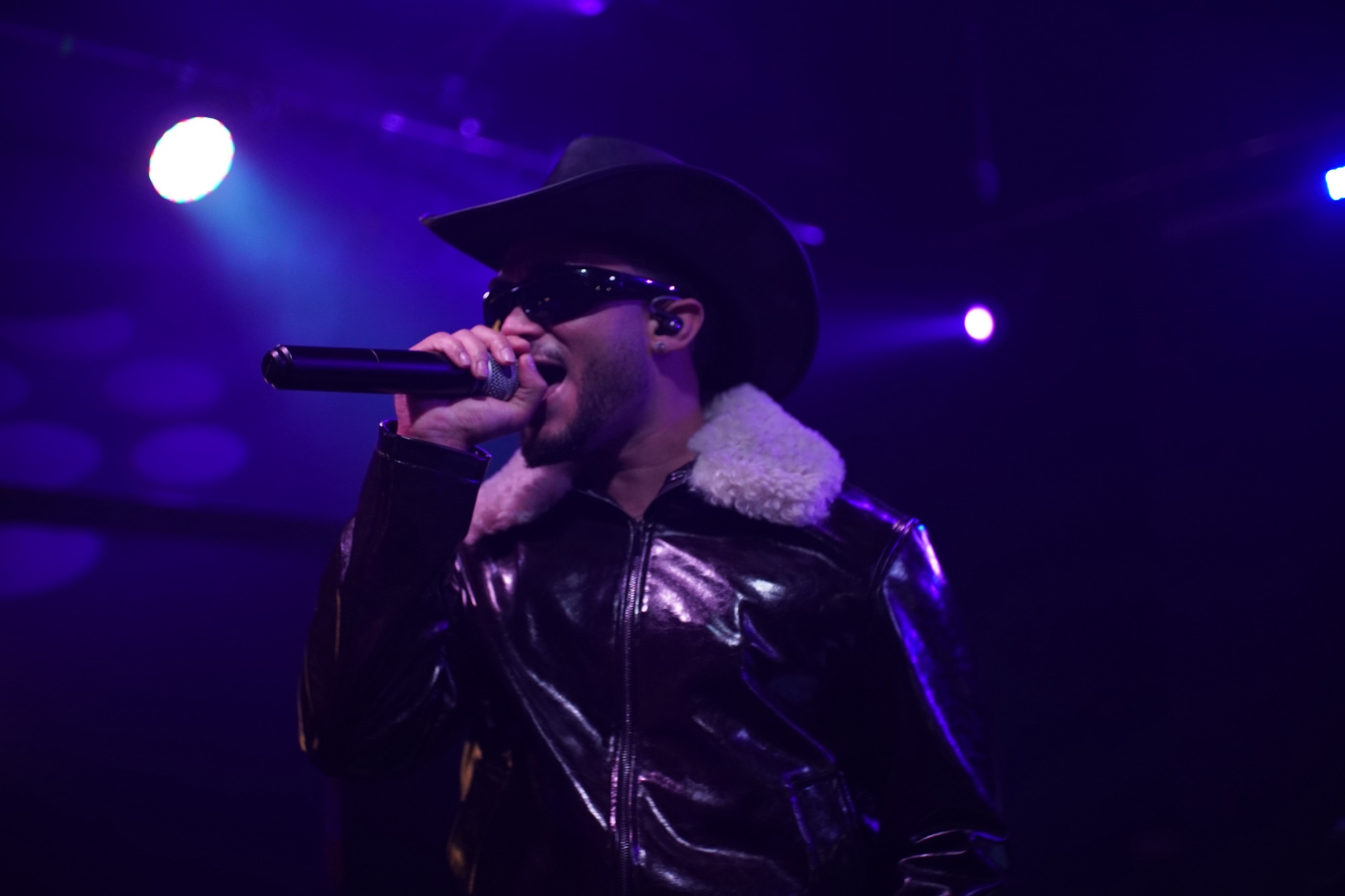 El protagonista de la noche entró con unos pantalones de chándal, una cazadora de cuero y, como no podía ser de otra forma, con un sombrero vaquero. Ya desde hace meses mantiene esa estética de los sombreros en sus redes sociales, haciendo de ese objeto algo característico suyo. También entró con unas gafas de sol puestas, pero tan solo en la tercera canción ya se había deshecho de ellas. Fue en ese mismo tema que, de todo lo que se estaba moviendo en la tarima, estuvo cerca de resbalarse, pero lo disimuló con una buena puesta en escena y los nervios no volvieron a jugarle una mala pasada en ese aspecto.