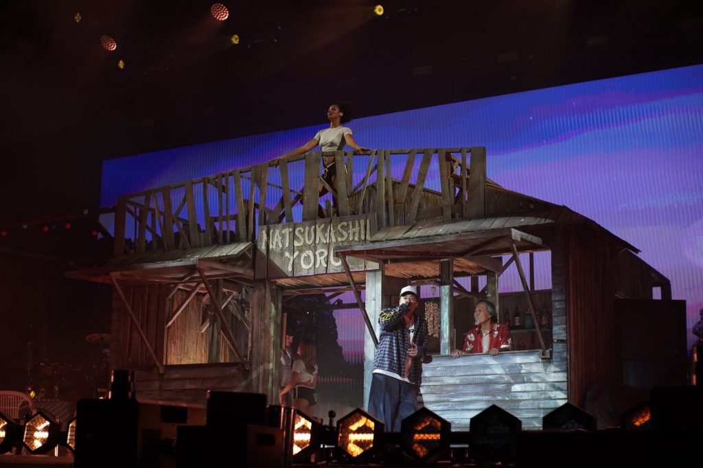 Las nueve menos diez marcó el momento de suerte de los que tenían el sitio más cercano al escenario, cuando varios “saikoworkers” salieron con cajas para lanzar bufandas al público. Minutos después las pantallas, una a cada lado del escenario, mostraban caras de ilusión que poco a poco se fueron disimulando por el humo que preparaba la salida del cantante. El escenario era mucho más que una tarima de suelo negro, literalmente representaba la portada del último disco del artista, con todo un chiringuito montado para acoger la narrativa del concierto.